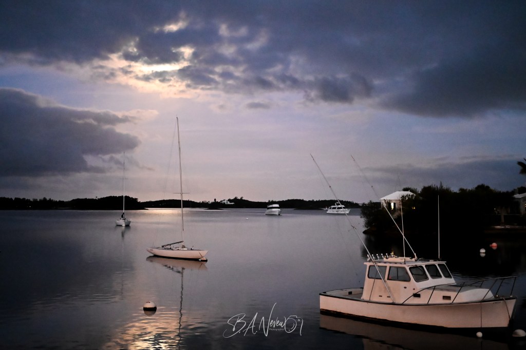 Taking it all in I felt suspended in time. Sailboats and fishing boats rested quietly at anchor, their reflections trembling only slightly on the calm water. Across the harbor, the dark line of shoreline and small islands gave the composition a sense of stillness and depth, while the warm lights from homes at the edge of the frame reminded me that Bermudians were only just beginning to stir.