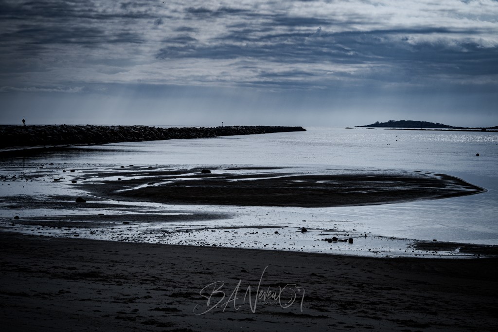 The sky hung low and heavy, layered in gray, but not without a break. The sun found its way through in narrow shafts, cutting clean lines across the water. Where that light touched, the channel shimmered—just enough to catch your eye if you were patient.